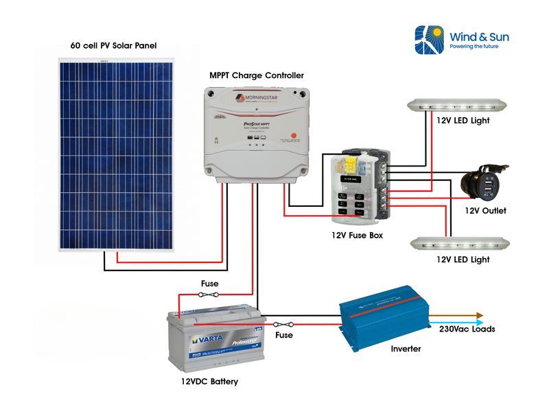 These connect to the van storage battery (usually 12V) via a charge controller which stores power for later use. Power can then be used directly to run 12V DC loads such as: LED lighting, TV, radio, pumps, fans, phone charging.