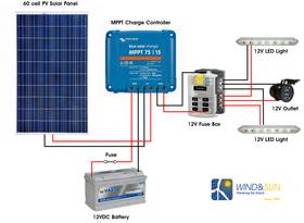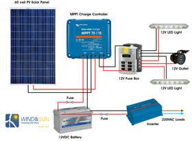 Here, all energy sources are coupled via Direct Current (DC). During the day, energy generated by the PV array can be used to run loads and any surplus is used to charge a battery. A DC charge controller is used to prevent the battery from overcharge. This stored energy is then available in the evening for operating lighting and other DC loads.