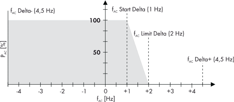 - fAC Delta– and fAC Delta+ refer to the maximum range relative to fAC in which the PV inverter is active.