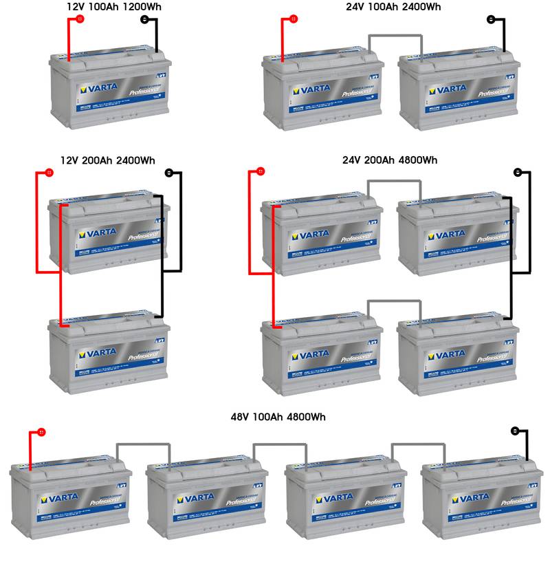 If a large battery bank is needed, it is not recommended to construct the battery bank out of numerous series/parallel 12V lead acid batteries. The maximum is at around 3 (or 4 ) paralleled strings. The reason for this is that with a large battery bank like this, it becomes tricky to create a balanced battery bank. In a large series/parallel battery bank imbalance is created because of wiring and because of slight differences in battery internal resistance. This can lead to loss of efficiency, incorrect charging and premature ageing of the batteries. Instead, consider using 6V or 2 V lead acid batteries or lithium batteries.