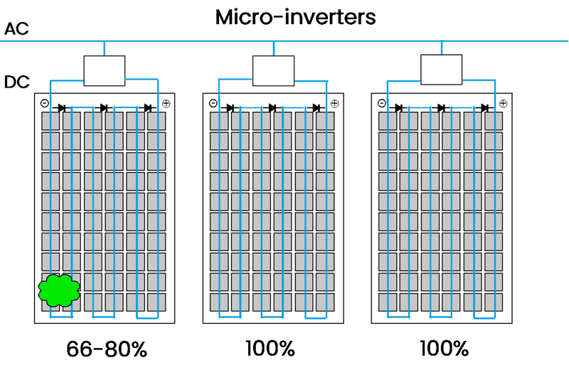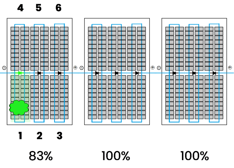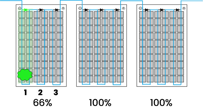 Cells in a panel are connected in series, like links in a chain. Setting up the cells and panels in this way means that they all produce the same current under the same irradiance. Most cases of shading however, are not uniform across the panel string, so if the current drops at one point, the whole chain is restricted and output is reduced to a level determined by the lowest performer in the series.