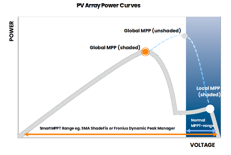 With shading, the inverter needs to search for a new maximum power point. Unfortunately, the new maximum peak can often be at a significantly lower voltage than the original maximum. This can cause the inverter to find a ‘false peak’ and mistakenly think that the new maximum power point under the shaded conditions is at the Local MPP instead of the Global MPP, resulting in a lower power output.