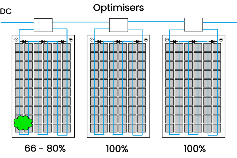 Where there is severe partial shading, either microinverters and power optimisers can provide a solution. These enable each solar panel to operate independently, so even if one panel is shaded, the other panels can continue to function at maximum capacity.