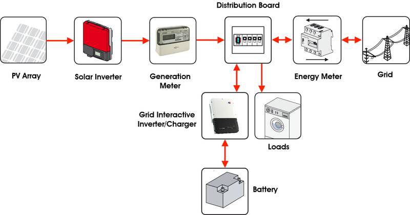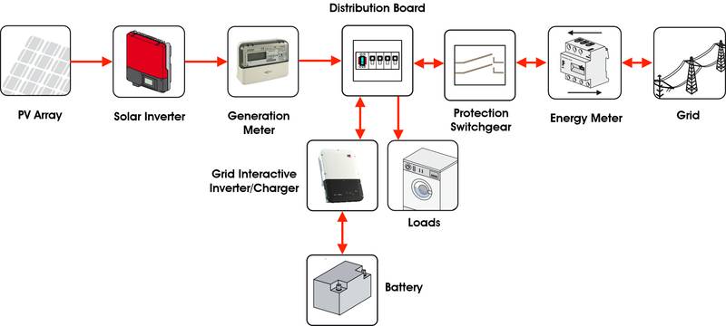 For back-up applications the grid-interactive inverter is connected to the battery bank, an AC distribution board for loads needing back-up, and the building supply, using an automatic transfer switch if required.