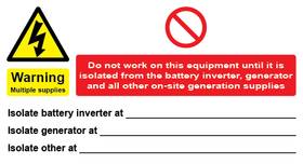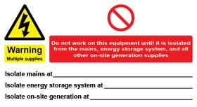 - In systems with two AC sources (generator or grid and inverter) warning signs must be located near switchgear or consumer units and both supplies switched off before doing any work on circuits or equipment.