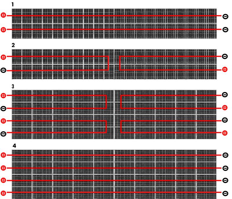 Solar photovoltaic (PV) panels can be wired to increase voltage and/or current.