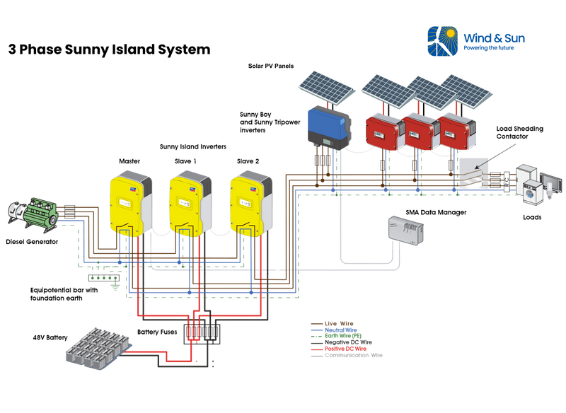 Different sizes of inverter chargers can be chosen to meet your requirements, several can be used in parallel for bigger applications or multiples of three can be used for three phase. For more than one set of three please see Minigrid Off-Grid Systems.