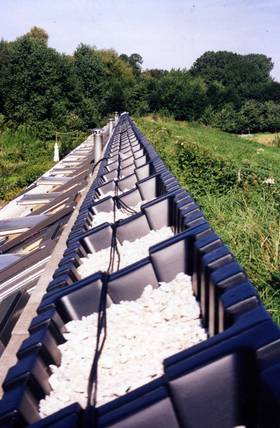 The majority of modules (76) are mounted along the conservatory parapet using 'ConSole' flat roof mounts with an inclination of 25 deg. These are black plastic tubs filled with stone ballast which don't require mechanical fixing or roof penetrations. They can also be moved relatively easily, given sufficient cable length, for roof maintenance purposes. In addition 7 modules are mounted on each end of the development on a galvanized steel framework fastened to concrete paving slabs with an inclination of 30 deg.