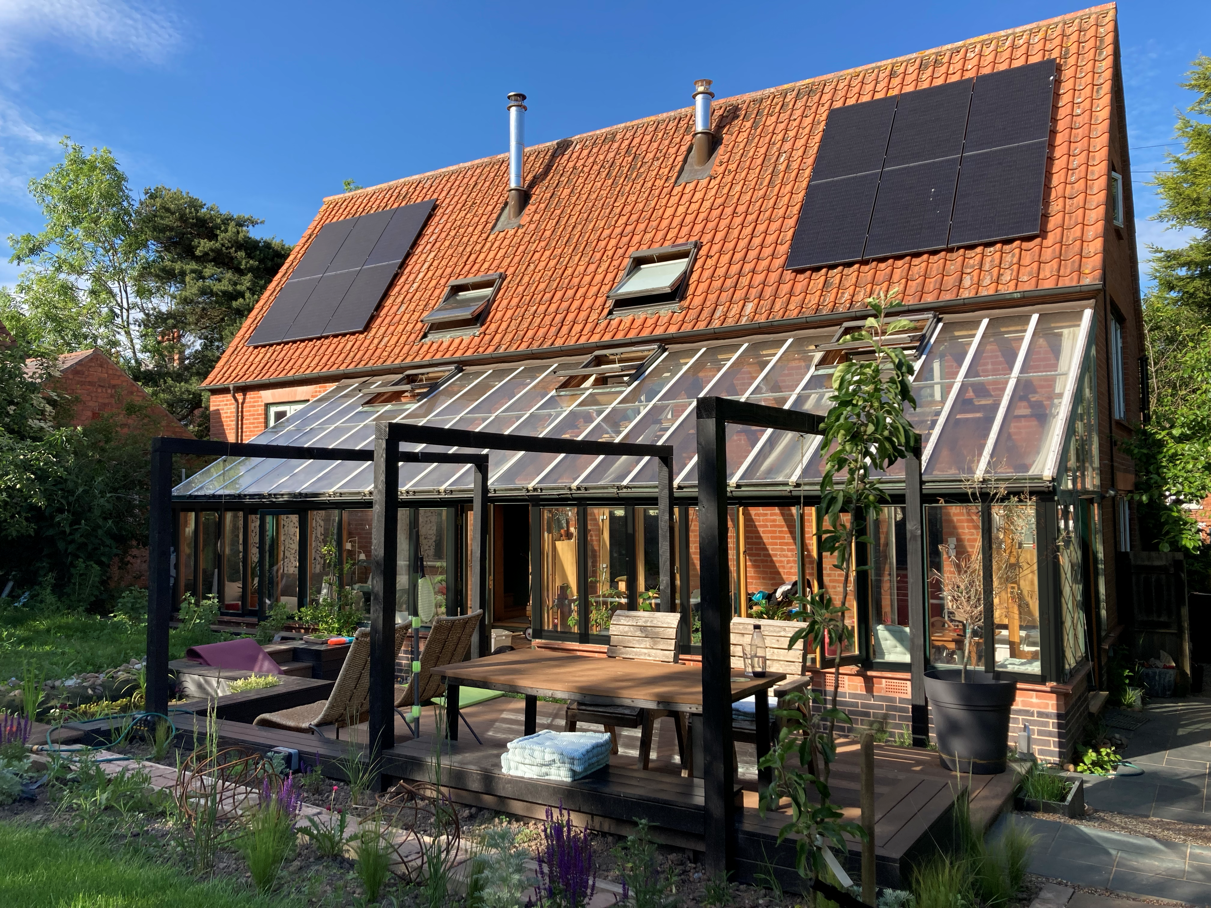 The original pergola and PV array have been dismantled and re-purposed elsewhere. The new owners of the house moved them because they dominated (and shaded) the garden and they wanted to grow more food, and obviously it is now easier to put PV on roofs. A new 4kWp PV array has been installed on the house roof although this achieves less due to orientation (west facing at 55°). It was installed as part of a community effort, one of around ten local homes to install solar PV in spring 2020.