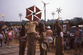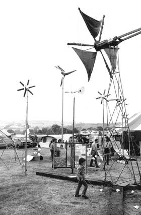 During the 1990's Hugh Piggott travelled down from Scoraig on the Scottish West Coast to help, providing some extra windpower and demonstrating his home built wind generator design based on the brakedrum of a Ford transit van. On occasions he would be joined by Andrew Kerr (Andrew was behind the 1971 Glastonbury Fayre and had lived on Scoraig) and with Hugh's wife Jytte they would demonstrate spinning wool using wind-powered spinning wheels.