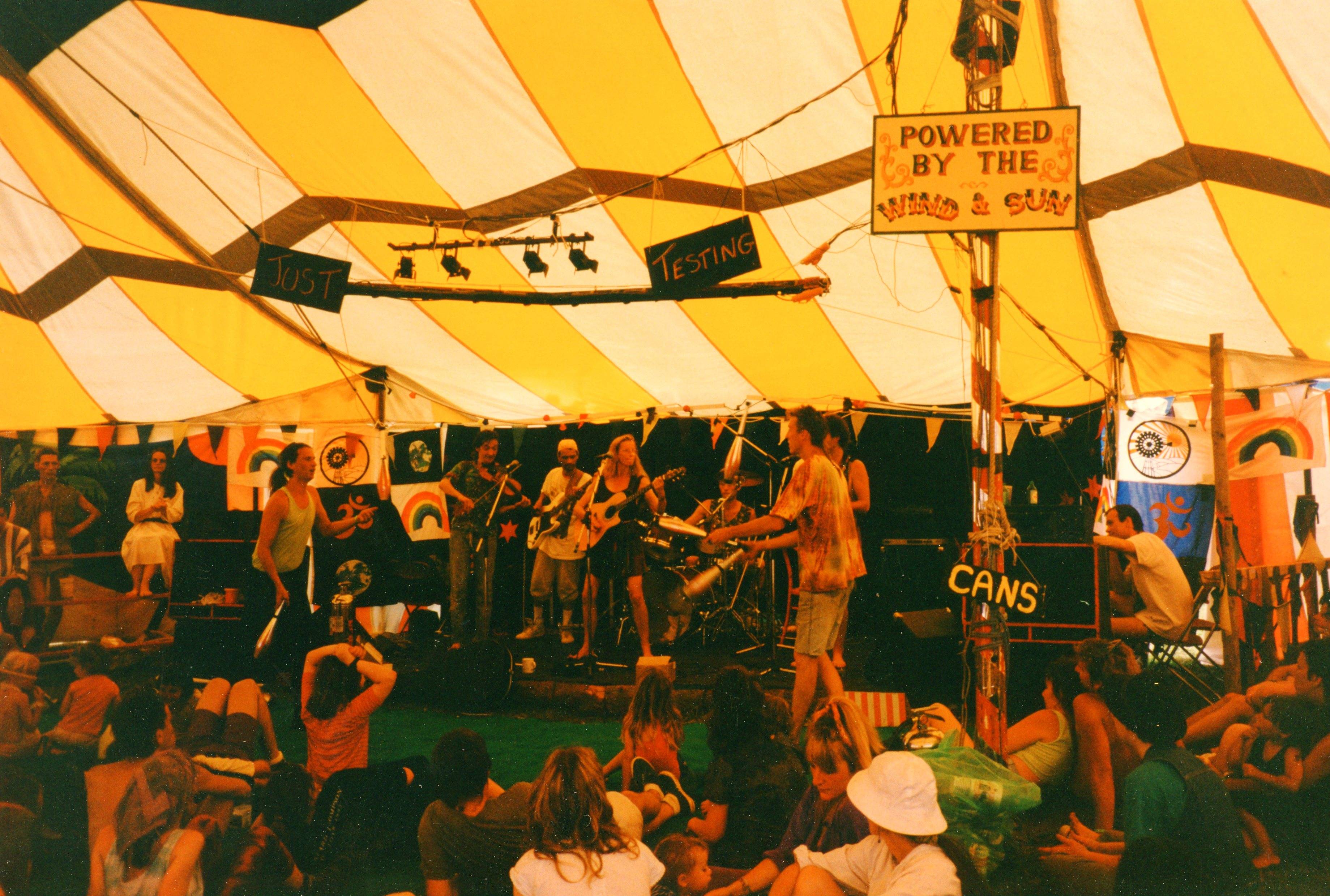 In the early days power was provided mostly from small wind generators (as solar PV was then prohibitively expensive) and over the years what we have been able to do has reflected the technology available at the time. To start with everything was run at 12V DC (and we constructed a custom 12VDC stage lighting rig to suit), then inverters were incorporated to run PA equipment (and we struggled for years to eliminate the hum caused by the square wave output). More recently wind has taken a back seat and solar come to the fore with modern high quality sine wave inverters used to power everything.