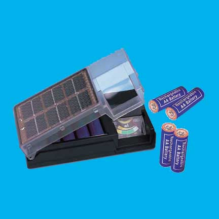 Charges 2 or 4 AA NiCd batteries in approx 16 hrs of bright sun (2-4 days). Includes meter