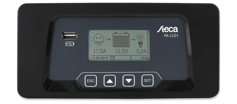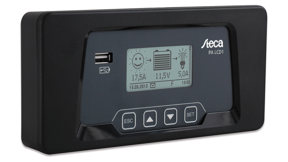 Remote graphical display for the Steca Solarix 2020-x2 solar charge controller. Energy flow is displayed as a graphic, making it intuitively understandable. Includes comprehensive data logger enabling full monitoring of the entire system. Virtually all charge controller parameters can be set and modified which allows the distribution of charge power between the two batteries to be adjusted. For the load output, all automatic time and battery voltage functions are fully programmable.