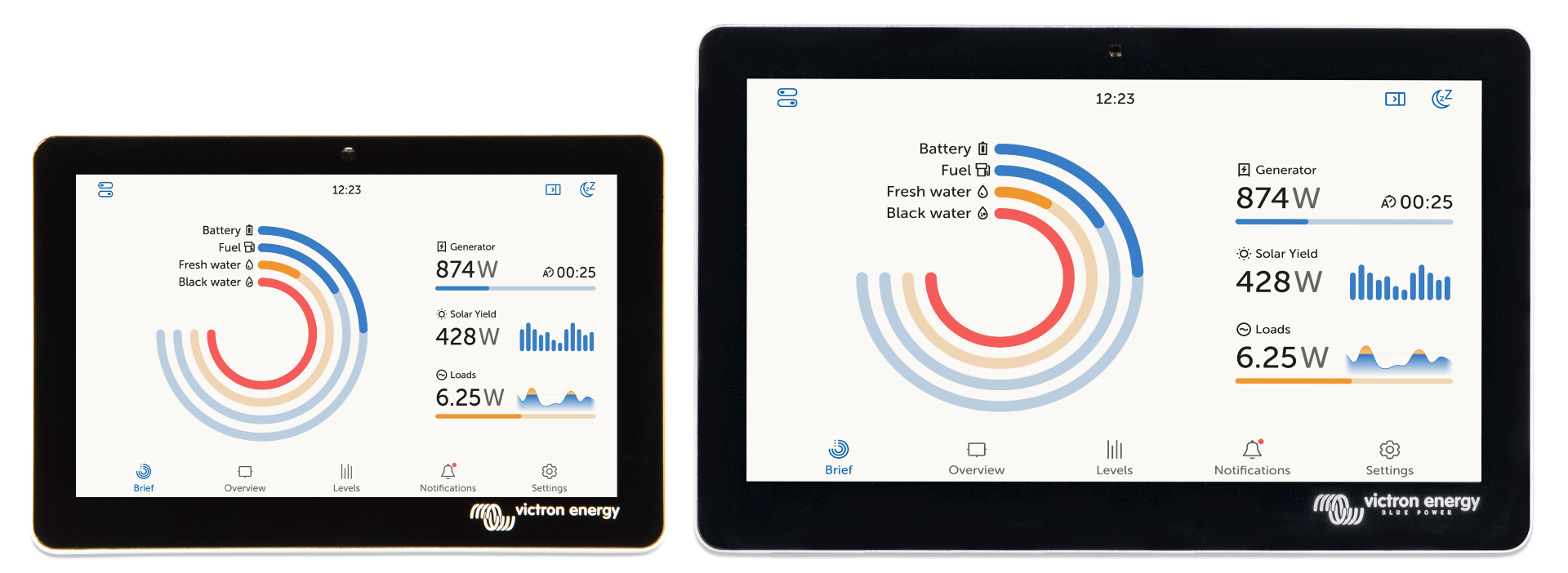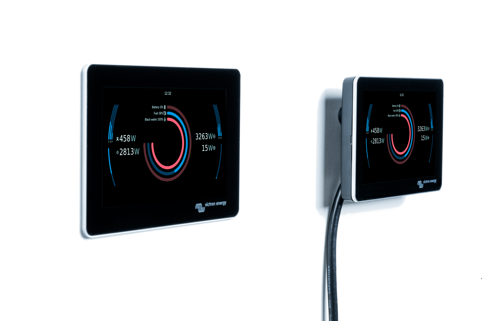 The GX Touch 50 & GX Touch 70 are the display accessories for the Cerbo GX. The five inch and seven inch touch screen displays give an instant overview of your system and allow to adjust settings in the blink of an eye. Simply connected to the Cerbo GX with one cable, Their super slim waterproof design, top-mountable setup and simple installation bring a lot of flexibility when creating a crisp and clean dashboard.