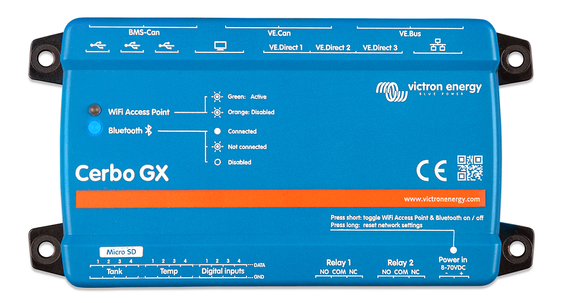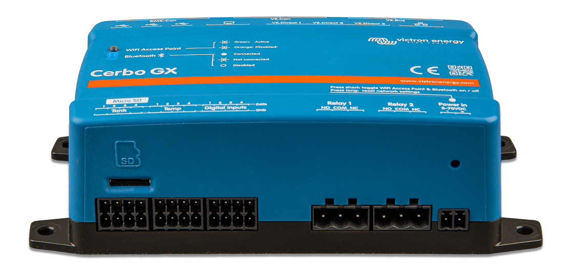 The Cerbo GX enables you to monitor and control your system from anywhere, at any time. It is designed to be a versatile centrepiece that seamlessly connects to your other Victron connected products and supported third party devices. Master remote systems with real-time monitoring, historical analysis, remote access and control with the Victron Remote Monitoring (VRM) portal and VictronConnect app. Or simply connect a GX Touch display for direct control. With plenty of possibilities, the Cerbo GX puts the power in your hands.